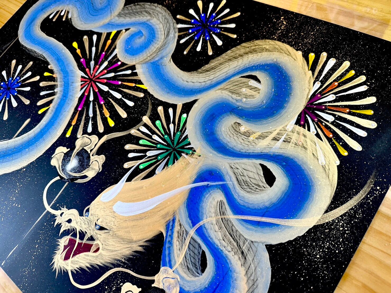 金色のベース色にウルトラマリンを配色し、涼しげでありながら、強い生命力を感じる龍を生み出しました。